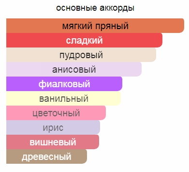 Средние ноты: Лакричник, Вишня, Ирис, Корень ириса и Амариллис;